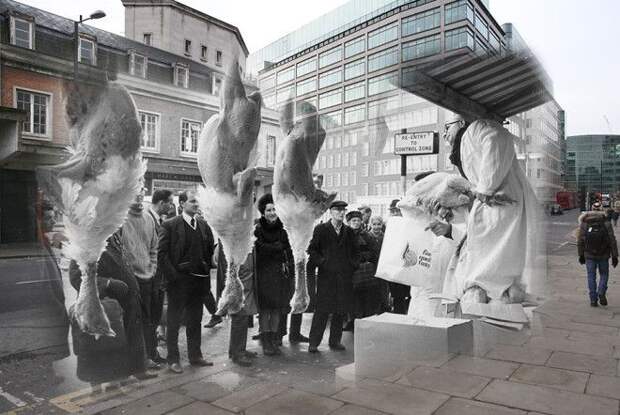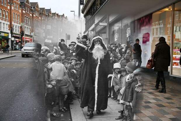 Под Новый год даже взрослые готовы поверить в чудеса, например в существование машины времени. Фотограф Питер Макдермид пофантазировал на эту тему и создал удивительные рождественские снимки — гибриды современных городских пейзажей Лондона и соответствующих фотоизображений былых времен.