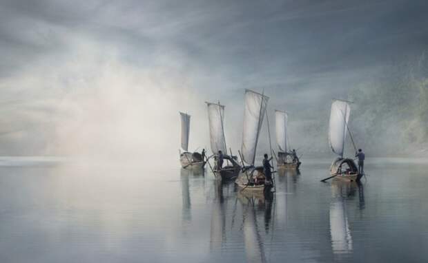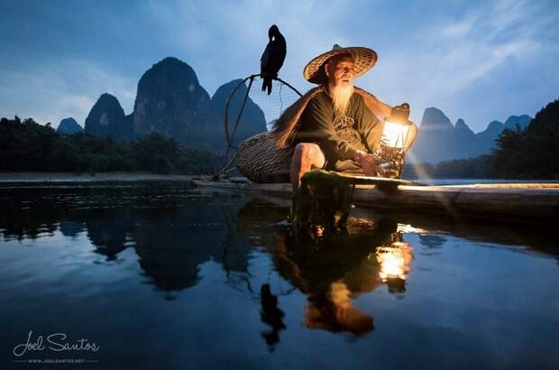 Китайские рыбаки, выходящие на утреннюю рыбалку.