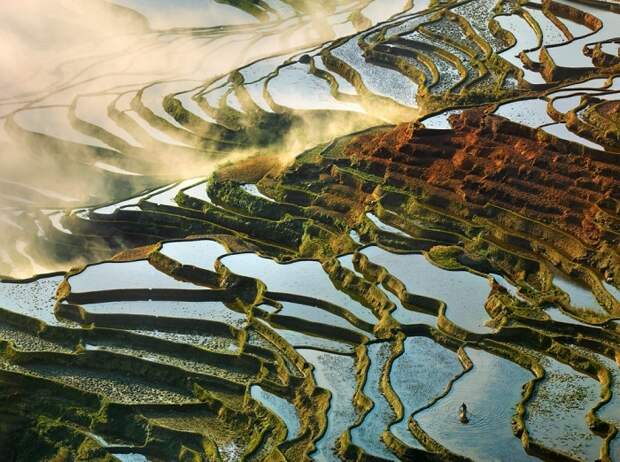 Солнечный свет отражается в водной глади затопленных рисовых полей на высотных террасах.