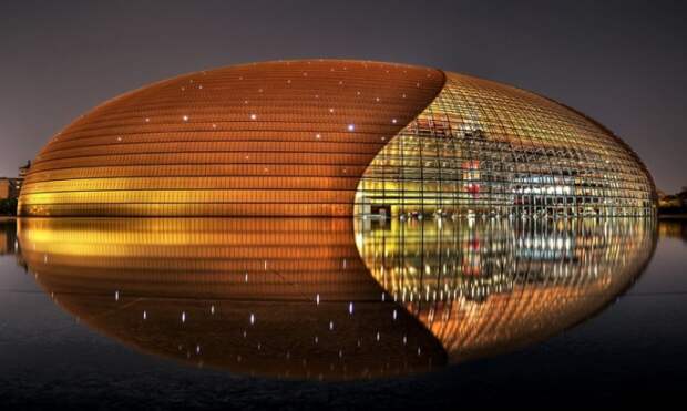 Оперный театр представляет собой эллипсоидный купол из стекла и титана, вздымающийся посреди искусственного водоёма, через дорогу от озера Чжуннаньхай.