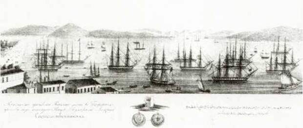 Эскадра Черноморского флота в Босфоре. Гравюра 1830-х годов