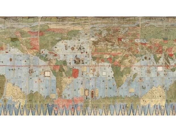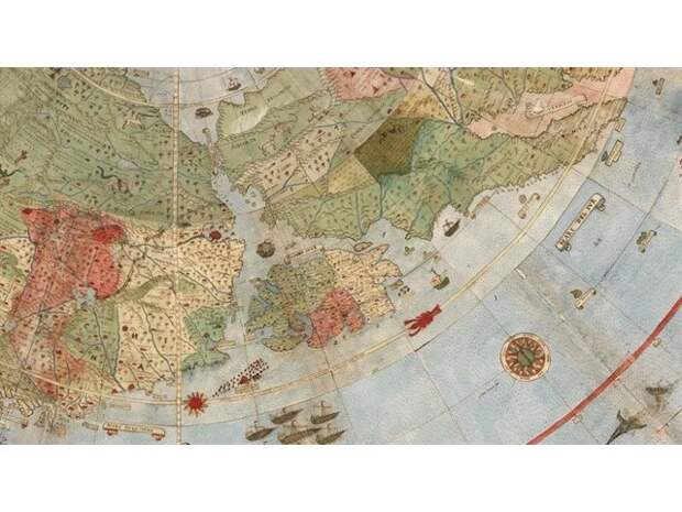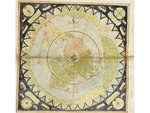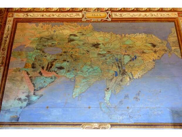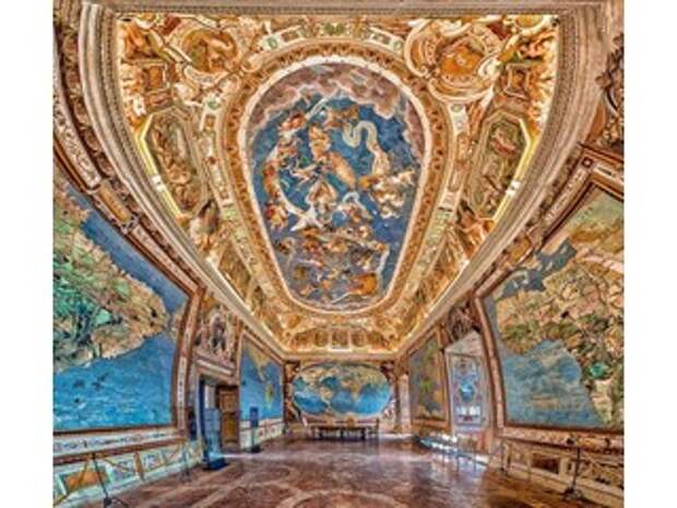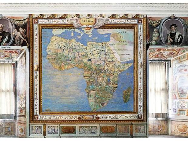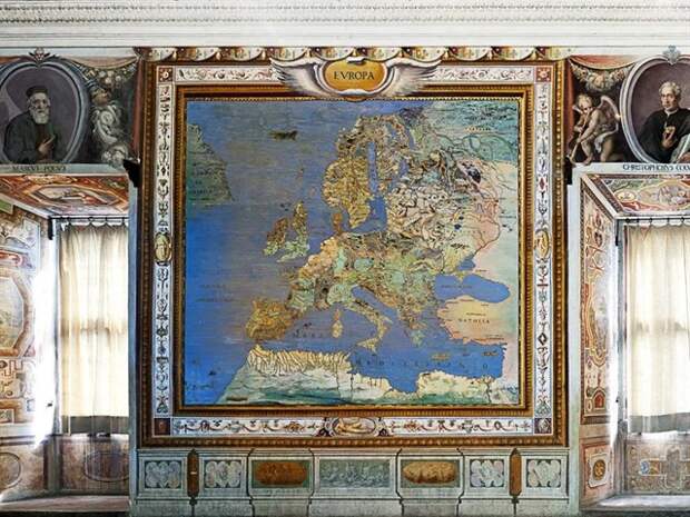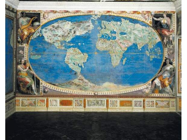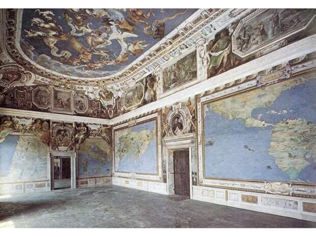 В итальянском местечке Капрарола есть вилла Фарнезе (Палаццо Фарнезе) - укреплённая усадьба кардинала Алессандро Фарнезе, построенная в 16 в. А вилле есть очень интересный зал Сала дель Маппамондо, где на стенах, полу и потолке нарисована планета Земля м ее материками в кофигурации 16 века.