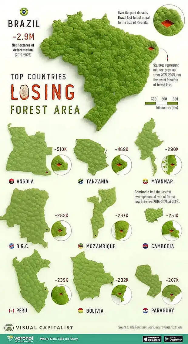 Эта инфографика показывает страны, которые потеряли больше всего лесов с 2015 года, по данным Продовольственной и сельскохозяйственной организации ООН (ФАО). С утратой более 2,9 миллионов гектар Бразилия опережает все остальные страны по масштабам обезлесения с большим отрывом.