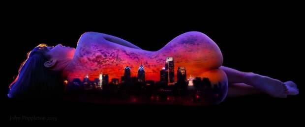 Работы калифорнийского художника Джона Попплтона, который раскрашивает обнаженных девушек флуоресцентной (ульрафиолетовой) краской и снимает их в темноте.
