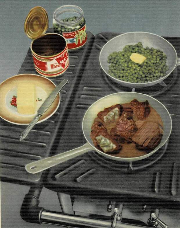 Иллюстрация из книги «О вкусной и здоровой пище». И прямо-таки мой обед. Во всяком случае где-то до 1962 года все именно так и было. Потом гречка постепенно стала редкостью. Часто в готовке использовались полуфабрикаты. Кисель, во всяком случае, у нас был именно такой