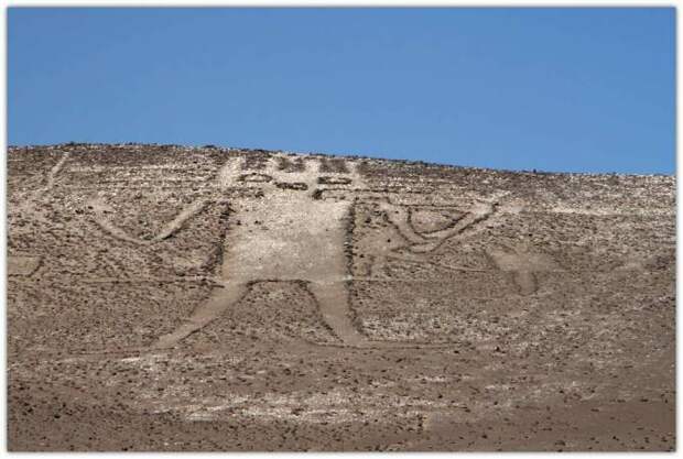Похоже, самыми плодовитыми древними художниками были индейцы — пустыня Атакама на берегу Тихого океана в северной части Чили изобилует подобными картинками. Самыми интересными из них считаются геоглифы на холме Унитас между городками Тарапакаи Гуара. Там, например, можно увидеть стометровую фигуру колдуна с шестиугольной головой, увенчанной подобием короны с четырьмя перьями.