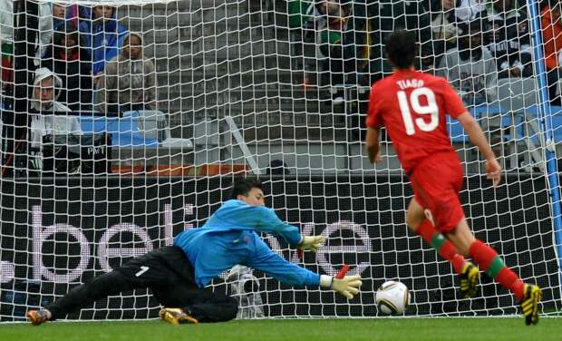 ЮАР, Кейптаун: полузащитник португальской сборной Тьягу забивает гол в ворота сборной Северной Кореи (вратарь Ри Мен Гук) во время матча первого тура ЧМ 21 июня 2010 в Грин-Пойнт. Фото: AFP PHOTO/HOANG DINH NAM |
