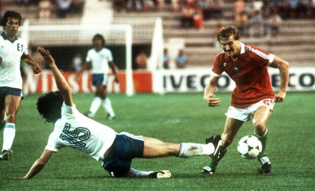 14 июня 1982 года, Эльче, Испания. Сальвадорец Родригес теряет мяч в схватке с игроком венгерской сборной. Матч между Сальвадором и Венгрией закончился с разгромным для Сальвадора счетом 10:1. Фото: Image by © Staedele/dpa/Corbis |
