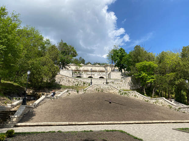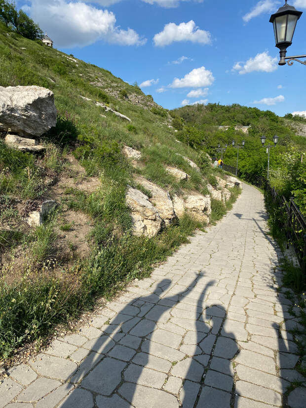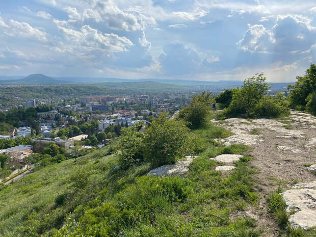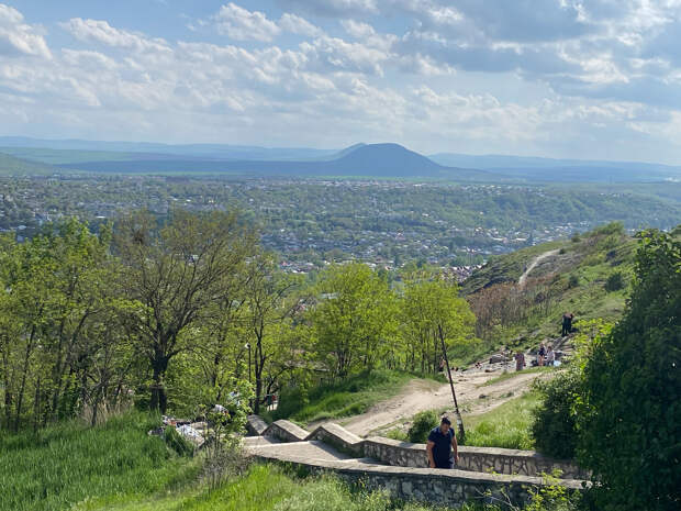 Перед входом в пещеру есть небольшая площадь со скамейками и небольшой обзорной площадкой. Можно отдохнуть перед очередным марш броском. А он отсюда может быть в двух направлениях – к месту дуэли Лермонтова или на гору Машук. В обе стороны идти по горе и достаточно долго. Но так как мы были настроены именно на пешие восхождения, то пошли в сторону «бесстыжих ванн» и Емануелевского парка.