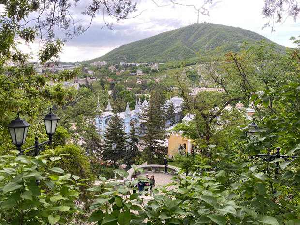 Отсюда открывается самый лучший вод на Лермонтовскую галерею и разноцветные цветники. Очень красиво все это оттеняет гора Машук, которая тоже хорошо просматривается с этого парка.