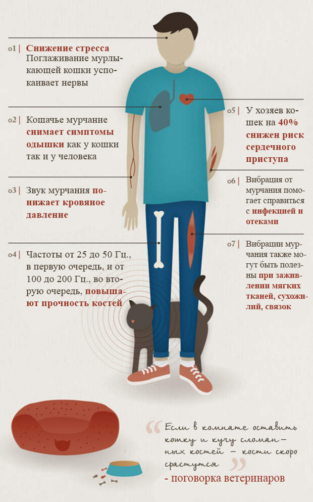 Когда они урчат от удовольствия, вибрируя на частоте от 20-140 Гц, у человека, на чьих руках, коленях, груди лежит довольная кошка, уменьшается стресс, они могут предотвратить сердечные приступы, исцелить проблемы с дыханием и т.д.
