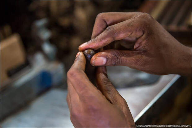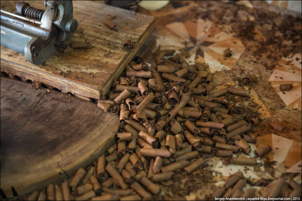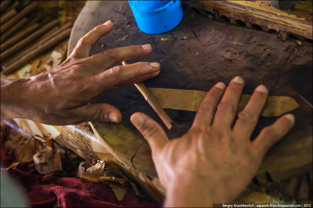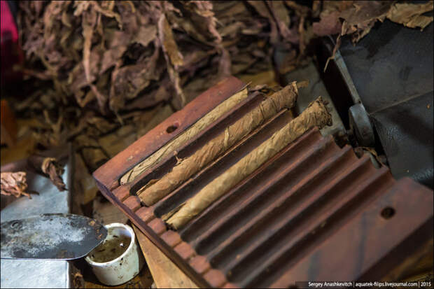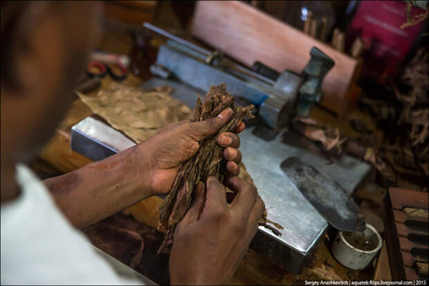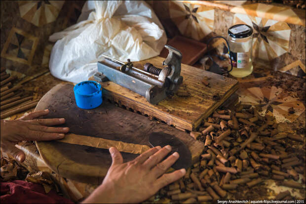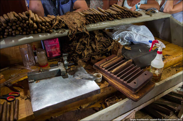 Это рабочее место торседора, именно так называется мастер, который делает сигары. Как вы могли заметить по первому фото, это парень, а не никакая не девственница, и сигары он крутит не на бедре, а на специальном столе с отполированной табачными листьями металлической плитой.