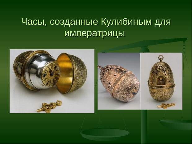 Кулибин стал способным учеником часового мастера, а вскоре и сам начал изготавливать часы, которые славились на весь Нижний Новгород. Уже зрелым человеком он задумал сделать такие удивительные часы, которые могли бы понравиться самой императрице. Его замысел спонсировал купец Михаил Костромин. В 1767 году, во время поездки Екатерины II по Волге, Костромин представил Кулибина графу Григорию Орлову, а через того – и императрице. Государыня взяла с Кулибина слово, что часы будут изготовлены и преподнесены ей.