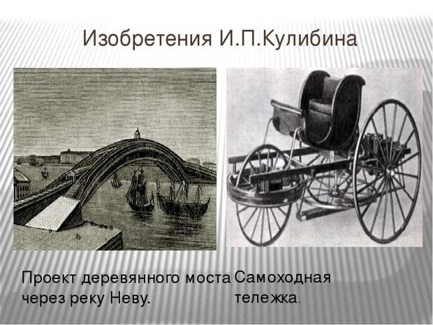 Прочие изобретения Кулибина имели характер забавных игрушек и не нашли практического применения. Сам Кулибин верил в возможность создания вечного двигателя. Построенный им «водоход», двигавшийся вверх по течению якобы силою падавшей на него воды, оказался, как и следовало ожидать, никчёмным. Арочный мост через Неву вышел бы чересчур дорогостоящим. Лифт в Царскосельском дворце, который он построил в 1785 году для больной и пожилой императрицы, приводился в движение несколькими крепостными, вращавшими подъёмный винт. «Самобеглая коляска» только в 20 веке послужила основой для педальных детских автомобильчиков. Кстати, Кулибин не первым изобрёл её – в первой половине 18 века её придумал крестьянин Леонтий Шамшуренков. Прототипом инвалидной коляски не была ни та, ни другая, так как приводилась в движение педалями для обеих ног.